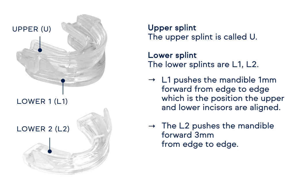The device is designed to be used overnight by putting it in the mouth while sleeping. We recommend starting with the Upper arch and Lower 1 (L1) arch.